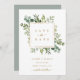 Cette invitation de mariage à conserver présente des feuillages de eucalyptus peints à l'aquarelle, des feuilles vertes et un cadre carré doré. Pour une personnalisation plus avancée de ce design, veuillez cliquer sur le lien "Personnaliser davantage". Des articles assortis sont également disponibles.