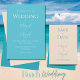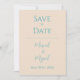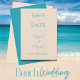 Magnifique fond de couleur sable avec une police bleu océan « Enregistrez la date » qui est parfaite comme prélude à votre invitation officielle pour tous vos invités. Réalisé avec de belles polices dans un bleu océan simple et pourtant élégant. Parfait pour votre occasion spéciale. Un beau 'Save the Date' pour votre mariage à la plage.