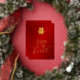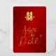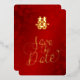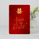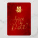 Cette carte Save the Date présente un symbole artistique doré de double bonheur et un script calligraphique sur un fond floral rouge scintillant.
