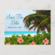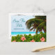 Cette conception hawaïenne romantique présente une photo d'une plage de sable blanc avec l'océan dans de belles nuances de bleu. Les palmiers et les fleurs d'hibiscus se balancent doucement dans la brise. Personnalisez cette carte postale avec les détails de votre mariage imminent. Celles-ci sont idéales pour les mariages à Hawaii, sur le thème de la plage ou de destination.