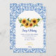 Vous organisez un mariage sur le thème méditerranéen italien ou utilisez des tournesols dans votre bouquet ou dans vos décorations de centre de table ? Alors vous allez adorer cette combinaison classique unique de carreaux modernes bleus et blancs avec un design d'invitation de mariage avec eucalyptus et tournesol ! Personnalisez avec vos détails