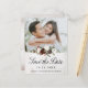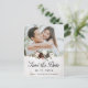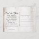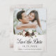Cette carte de mariage florale à photo rustique personnalisée comporte votre photo en haut, ornée d'un bouquet de roses aquarelles bourgogne et rose pâle avec de la verdure. En dessous, dans une typographie noire élégante, il est écrit "Sauver la date" avec vos noms à personnaliser. Le verso de la carte postale contient davantage d'informations sur votre mariage à personnaliser. Félicitations pour vos fiançailles et votre mariage ! Conçu par Susan Coffey.
