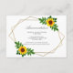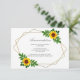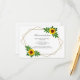 Le design présente des tournesols et des feuilles botaniques sur un cadre géométrique imprimé couleur or.