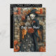 Carte de mariage Halloween avec un couple de squelettes mignons habillés avec élégance. La mariée porte une robe noire avec des images de crânes et a des citrouilles dans les cheveux. Le marié porte un costume noir et un chapeau haut de forme pointu. De grosses araignées noires rampent autour tandis qu'une chauve-souris est suspendue à la cheminée. Invitation de mariage gothique qui peut être personnalisée selon vos besoins.