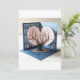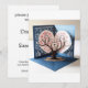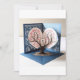 Cette image montre une carte de mariage 3D ouverte. Le design montre un arbre avec des branches ramifiées portant des feuilles en forme de cœur rose, symbolisant l'amour et la romance. Le fond bleu présente des détails fins de gravures blanches qui ajoutent une touche artistique et esthétique à la carte. Le design est innovant et attractif, reflétant des sentiments d'amour et de connexion, ce qui le rend très approprié pour une utilisation lors des occasions de mariage