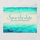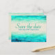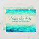 Carte de mariage pour sauvegarder la date, mer étincelante, peinte à l'aquarelle avec un effet de mer turquoise bleu et vert, avec une vague graphique superposée sur un fond sablonneux. Carte originale pour sauvegarder la date de mariage. Parfaite pour un mariage de destination plage, côtière ou tropicale. Fait partie de la collection mariage mer étincelante. Un design élégant et exclusif par Sarah Trett.