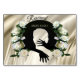 La conception de silhouette d'embrassade de Love is All there is avec du noir sur soie dorée avec des roses blanches fait une déclaration forte pour la papeterie de mariage personnalisée pour chaque invité sur la table