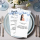 Carte de menu de fête d'anniversaire. Personnalisez et ajoutez un nom, un âge, une date et le menu. Un fond blanc et un grand ruban bleu.