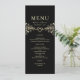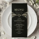 Ajoutez de la sophistication à votre réception avec cette carte de menu de mariage noir et or, avec une délicate dentelle florale romantique et un cœur de corde signature. Ce design élégant se marie parfaitement avec les décors de dîner formels et correspond à l'ensemble de votre suite d'invitation de manière transparente.
