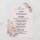 Embélissez votre jour spécial avec cette élégante carte de menu de mariage personnalisable, dotée d'accents floraux délicats et d'un fond rose doux. Parfaitement adaptée à vos goûts, ce menu propose une sélection de salades, de plats principaux y compris des options végétariennes, et de desserts délicieux. Chaque plat est décrit avec ses ingrédients savoureux, promettant une expérience culinaire délicieuse pour vos invités. Avec son design sophistiqué et sa touche personnelle, cette carte de menu devient non seulement partie intégrante du repas mais aussi partie des souvenirs de la célébration.