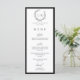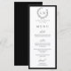Élégante carte de menu plat de mariage noir et blanc à monogramme couronne botanique.