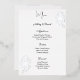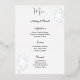 Cette carte de menu de mariage est présentée dans une élégante impression de rose en feuille d'argent et de blanc, avec un texte en écriture et standard de couleur noire.