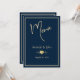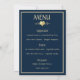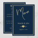 Une carte de menu de mariage classique marine et or conçue avec du texte de couleur or, des bordures et un accent en forme de cœur, sur un fond marine foncé. Pour personnaliser cette carte élégante, il suffit d'insérer le nom des mariés, la date du mariage et vos sélections de menu de mariage dans notre modèle facile, en remplaçant le texte d'exemple. N'oubliez pas de consulter les accessoires de réception assortis, notamment : la carte de table de mariage, la carte de placement, le livre d'or de mariage et la bannière.
