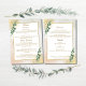 Élevez votre réception de mariage avec cette carte de menu luxueuse. Faisant partie de notre élégante collection verte et or, ce design présente une parties scintillant dorée scintillante, des textures d'aquarelle douce et une végétation réaliste d'eucalyptus. C’est la façon idéale de présenter vos choix culinaires avec style et raffinement. Customisez ce menu pour afficher vos options de nourriture et de boisson pour une expérience client vraiment personnalisée.