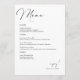Présentez notre Elegant Hand Lettered Mariage Menu Card, l'ajout parfait à votre décoration de réception de mariage. Ce menu magnifiquement conçu comprend le mot "Menu" dans un élégant script à la main en haut à gauche, donnant un ton sophistiqué pour votre événement. Le menu personnalisé est élaboré dans une police de style serif noir intemporelle, alignée à gauche pour un look classique. En bas à droite, les noms du couple sont affichés dans une extravagante police de caractères sous le mot "savourez !" écrit dans un script personnalisé écrit à la main. La disposition verticale de 5"x7" sur un arrière - plan blanc immaculé garantit que ce menu complétera n'importe quel thème mariage, ajoutant une touche d'élégance et de personnalisation à votre journée spéciale. Parfait pour les couples qui veulent impressionner leurs invités avec une touche sophistiquée et customisée, notre Elegant Hand Lettered Mariage Menu Card est non seulement un article fonctionnel mais aussi un souvenir mémorable. Customisez-le avec le menu de votre choix et régalez vos invités avec la présentation élégante.