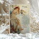 Cette carte mariage Art Nouveau enchanteresse présente une scène romantique et sereine d'une femme ornée d'une couronne de vigne, adossée gracieusement à un bord d'eau tranquille. Avec une palette douce et naturelle de vert sauge, de beiges chauds et de blues doux, ce design incarne l'élégance et le charme de l'époque Art Nouveau. Les détails complexes de la vigne évoquent un sentiment d'abondance et de nature, ce qui en fait une carte de menu idéale pour les vignes, les bohèmes ou les mariages à thème vintage. Le menu à l'arrière est présenté dans un agencement classique et élégant, apportant une touche de sophistication à votre décor de table mariage.