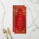 Des fleurs de cerisiers rouges et un double symbole de bonheur doré sur un arrière - plan rouge chatoyant. Avec des noms de mariée et de mariée personnalisés, la date du mariage et un texte de menu personnalisé.