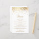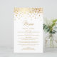 Ajoutez un accent élégant à votre paysage de table d'événements avec cette carte de menu personnalisable. Il présente des points de confetti en feuille d'or imitation avec un script élégant. Personnalisez cette carte de menu élégante en ajoutant vos propres détails. Cette carte de menu fausse feuille d'or est parfaite pour les mariages, douches nuptiales, baby showers, et bien plus encore.