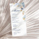 Impressionnez vos invités avec cette carte de menu mariage moderne avec d'élégantes fleurs d'aquarelle en bleu et or poussiéreux. Ce design s'associe parfaitement à notre collection de Mariages floraux bleu et or moderne, offrant un cadre de table cohésif et élégant. Customisez facilement avec tous les détails de votre repas, de l'entrée au dessert, avec vos noms ou votre date de mariage. Idéal pour les mariages romantiques, de jardin ou contemporains. Un beau gardien fonctionnel qui ajoute une touche de sophistication à votre réception.