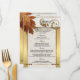 Une carte de menu chic et chic, avec des feuilles d'automne colorées sur un panneau en bois patiné blanc rustique, encadré par une doublure dorée et des tourbillons métalliques festifs. Une belle et élégante carte pour un dîner d'automne.