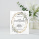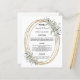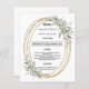Un arrière - plan blanc. Un cadre ovale imitant l'or décoré de vert sage. Personnalisez et ajoutez vos noms, votre date et le menu. Texte noir. 1 feuille = 1 menu imprimé bord à bord.