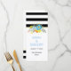 Carte mariage moderne et design qui présente de jolies fleurs folkloriques en bleu et jaune d'aqua, un groupe blanc aux contours dorés et un motif rayé noir et blanc.