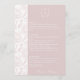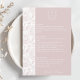 Carte de menu Mariage de Monogram Crest rose : poitrine monographique d'inspiration Vintage avec typographie élégante. Dispose d'un motif floral chinoiserie au verso et sur le côté pour une sophistication intemporelle. Entrez l'option d'outil de conception si des ajustements sont nécessaires lorsque le texte de votre menu est ajouté.
