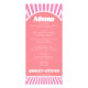 Cette carte de menu mariage a un style rétro super inspiré des années 70 avec le rose comme couleur principale. L'avant de la carte montre une arche bohème qui encadre le menu de mots et le reste du texte. Derrière l'arc, un arrière - plan de rayons de soleil roses et blancs crée un contraste. Le dos de la carte a un design en diagonale qui répète les noms du couple dans une police rétro. Cette carte est parfaite pour une fête mariage amusante et funky.