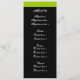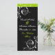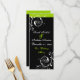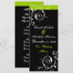 Élégante carte de menu mariage de couleur verte et fleurie, avec feuilles de défilement blanches, tourbillons, boucles et points verts citron sur arrière - plan noir. Il y a un groupe vert au sommet. Ce design chic, élégant et élégant fait partie d'un ensemble de produits en papier mariage et est parfait pour un mariage de printemps ou d'hiver.