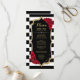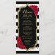 Carte de menu. Design noir blanc rouge élégant avec faux strass or. Rayures noires et blanches avec roses rouges. Parfait pour une fête élégante.