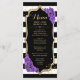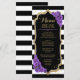 Carte de menu. Design élégant noir blanc violet avec faux or brillant. Caractéristiques rayures, police script et roses violettes. Parfait pour une fête élégante.