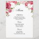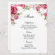 La carte de menu est présentée avec une impression d'art de jolies roses roses accentuées en haut de la carte, montrée sur le papier de base de la carte blanche. Script et texte standard en noir. Customisez les éléments du menu en cliquant sur le bouton customiser modifier, recherchez à droite et trouvez les cases appropriées pour modifier vos informations. Je vous souhaite de bons voeux pour votre jour de mariage.