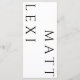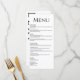 Gardez votre réception de mariage propre et moderne avec cette carte minimaliste de menu noir et blanc. Conçu avec une élégante simplicité à l'esprit, ce menu vertical présente une typographie audacieuse et une disposition simplifiée pour présenter vos choix de repas. Un choix intemporel pour les cravates noires, les mariages formels ou contemporains, et facile à personnaliser avec votre menu personnalisé.