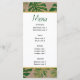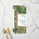 Carte de menu feuille vert et or rustique mariage. Ce joli design présente des feuilles de Split Leaf Philodendron (Monstera deliciosa) ou de Plante de fromage suisse et des feuilles de palme en vert avec contour or sur papier d'apparence kraft. Votre libellé est dans un cadre blanc avec contour doré.