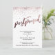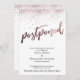 Si vous devez informer votre tribu d'une date mariage mise à jour, ce design festif pourrait être juste la pièce que vous cherchez! Dans cette conception, la police de caractères manuscrite a été utilisée pour créer un graphique qui dit "reporté", grand et gras ; l'image a été embellie avec un effet d'or rose faux métallique. Le haut des deux côtés a été accentué avec une image qui simule des confettis en or rose assortis qui semble tomber d'en haut. Utilisez les champs modèles pour ajouter vos détails personnels et faire de ce design unique et moderne votre propre. Tous les calques ont été ajoutés séparément et laissés déverrouillés pour vous donner le contrôle de conception, si vous voulez changer l'apparence d'une manière ou d'une autre. L'arrière - plan peut également être modifié en n'importe quelle couleur. // 100 //