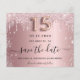 Une carte de mise en garde élégante et tendance pour une Quinceañera, fête d'anniversaire des 15 ans. Fond rose blush orné de confettis roses et argentés factices. Personnalisez et ajoutez une date et un nom/texte. Le texte : Sauvegarder la date est écrit avec un grand style de lettrage manuscrit tendance avec des fioritures. Numéro 15 avec une police de caractères de style ballon.
