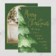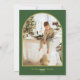 Envoyez vos vœux chaleureux pour les fêtes avec cette élégante carte de Noël à l'aquarelle, mettant en vedette un arbre peint de couleur vert tendre orné de neige délicate et de lettrage en écriture dorée qui dit « Joyeux Noël – Nous vous souhaitons une saison pleine de merveilles et de joie. » La conception de l'arrière qui correspond comprend un cadre photo arqué classique, parfait pour mettre en valeur votre photo de famille, entouré d'un fond vert riche avec des accents dorés subtils.