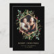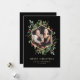 Cette magnifique carte de Noël présente votre propre photo de famille personnelle, entourée d'un cadre géométrique doré avec des feuilles dorées assorties, de la verdure de Noël et des baies de houx rouges sur un fond noir moderne. Un texte élégant dit « Joyeux Noël », mais vous pouvez le modifier pour votre propre vœu de joyeuses fêtes.