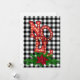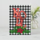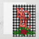 Carte de vœux de Noël à plat avec NOEL en lettres de cinéma rustiques qui tombent avec une guirlande de poinsettias sur un fond à carreaux buffle noir et blanc