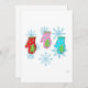 Ces cartes de Noël présentent trois couleurs de mitaines d'hiver, chacune avec un arbre de Noël et des points sur un fond blanc avec des flocons de neige bleus.