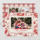 Cette carte de vœux plate multi-photos présente un fond toile classique avec des ornements de Noël rouges pour mettre en valeur une seule photo sur le devant, et jusqu'à 4 photos sur le verso à carreaux rouges assortis. Personnalisez vos photos et vos vœux, noms et année.