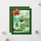 Carte de Noël avec un perroquet vert portant un chapeau de Père Noël vert assis dans un arbre.