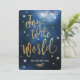 Une carte de Noël chrétienne très élégante avec typographie dorée "Joie au monde le Seigneur est venu!". Tout le texte est modifiable. Avec un espace design bleu avec étoiles arrière - plan et petites étoiles blanches autour du texte doré. Une carte de voeux chrétienne originale de Luckz.