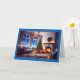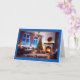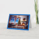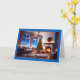 L'avant de cette carte de Noël présente une scène de salon cosy et élégante, sur fond d'un merveilleux paysage hivernal enneigé visible par de grandes fenêtres. L'intérieur est lumineux et dispose d'un sapin de Noël joliment décoré, orné de lumières brillantes et entouré de cadeaux soigneusement emballés. Une couronne avec un arc rouge vif est suspendue au-dessus d'une cheminée, où un feu chaud crépite, ajoutant à l'ambiance accueillante. La chambre est décorée avec goût avec un mobilier moelleux et moelleux, dont un canapé confortable aux coussins rouges festifs, complétant le thème des vacances. Le ciel bleu profond du soir et les arbres enneigés visibles à l'extérieur rehaussent la chaleur et le confort de la scène intérieure. La bordure de la carte est d’un bleu gras, encadrant l’image, et les mots "Joyeux Noël" sont écrits dans un élégant script noir et rouge en bas, ajoutant une salutation joyeuse au design. Cette carte reflète parfaitement l'esprit paisible et joyeux de Noël, ce qui en fait l'endroit idéal pour envoyer des voeux de vacances chaleureux à des amis et à la famille. Il est parfait pour ceux qui apprécient les images de vacances classiques et chaleureuses.