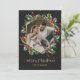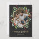 Élégantes cartes de Noël en noir et or avec titre calligraphique et cadre de photo géométrique orné d'une couronne d'aquarelle. Personnalisez facilement ces belles cartes de Noël photo avec votre image et un nom de famille.