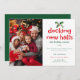 Une carte de Noël élégante et raffinée, simple, avec un modèle pour une photo, comportant un petit élément botanique hivernal : une branche de houx de Noël rouge et vert. Une charmante carte de Noël « nous avons déménagé » que vous pouvez personnaliser avec votre/vos nom(s), l'année et une photo de famille (ou une photo d'enfants, etc.).