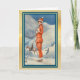 La façade de cette carte de voeux de Noël a une belle image d'une publicité dans le magazine français de l'ère victorienne La Vie Parisienne. Une femme en tenue de ski tient un poteau de ski à la main contre un bel arrière - plan de montagne. Derrière elle, un skieur est tiré par un cheval et un cavalier. Tout est encadré d'une doublure turquoise et dorée et placé sur un arrière - plan doré.C'est une belle image, et c'est amusant de fêter les fêtes de la façon désuète! L'intérieur gauche de cette carte est bleu correspondant, tandis que le côté droit contient votre message et votre signature faciles à customiser.
