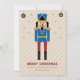 Une carte de vœux de Noël en rouge, marron et vert avec une illustration d'un casse-noisette, une boule et quelques étoiles sur un fond marron rayé. Vous pouvez l'utiliser pour Noël pour votre famille ou une entreprise, même pour une nouvelle année !