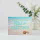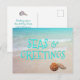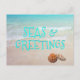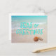 Carte de vacances mers et salutations avec scène de plage et coquillages. Tout le texte, au recto et au verso, est facile à modifier à votre goût. Un texte ombré de couleur bleu aqua clair est imprimé sur l'eau de l'océan tropical. Envoyez des salutations abordables depuis un climat chaud.