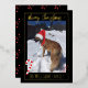 Une carte de Noël verticale élégante en papier métallisé or avec une photo d'un seul chien. Utilisez le modèle fourni pour remplacer l'image par la photo de votre animal préféré, vos vœux de saison et le nom de votre famille. Le dos de la carte est orné d'un motif de baies rouges.